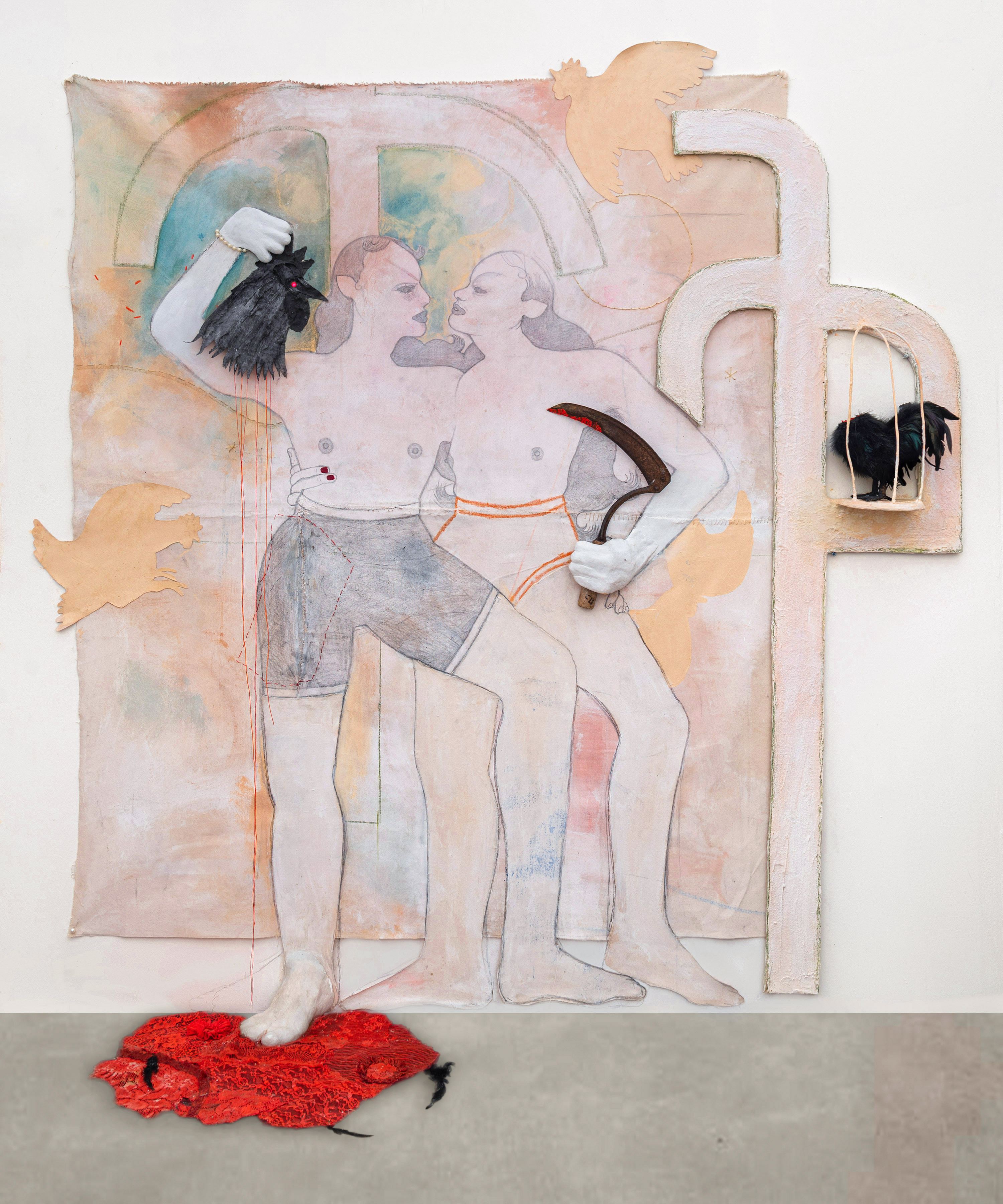 Amy Bravo, a New York visual artist of Italian-Cuban origin, combines symbolism –stylized palm trees, roosters, horses, slicked-back mustaches –icons from Latin American popular and religious culture and hyper-personal family stories, to invent her own vision, intimate and fantastic, of an afterlife universe in the rough shape of the island of Cuba. Bravo’s approach to painting is unconventional. Rather than the classic stretched canvases, she prefers loose canvas—cut and stitched together to create irregular shapes on which she mixes graphite drawing with painterly techniques and collage. The result are drawings which expand into painting, embroidery, and assemblage sculpture. This very personal combination of techniques serves to bring together complex identities, to recompose a family lineage interrupted by exile, to challenge and communicate with her ancestors and to draw the contours of a mythical world. Her works thus give birth to a rural colony populated by amazons, boxers, rooster-women, and cowgirls, proud and free figures at the crossroads of the communities claimed by the artist: Lesbian and Latin American.