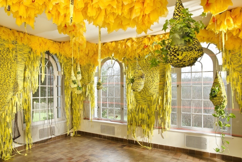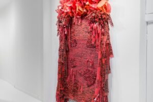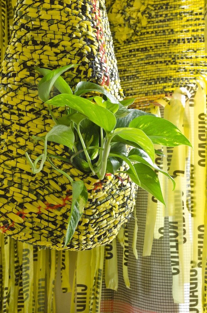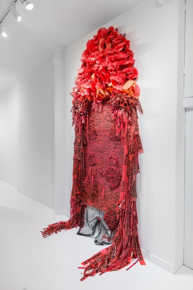 Borinquen Gallo is an Italian-Puerto Rican, Bronx-based artist whose work delves into themes of beauty, community, socio-cultural systems and structures through sculpture and installations made using a range of repurposed materials. Everyday detritus, construction, and packaging materials including trash bags, debris netting, and caution tape are painstakingly knitted, threaded, and reconfigured into lush textural weavings. Across a broad range of considerations — material, formal, psychologically intimate and social — the work aims to modulate between the familiar and the surprising so as to fundamentally disrupt viewers’ assumptions regarding what is valuable and discardable.