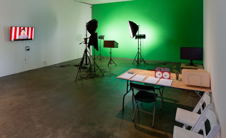 The back gallery of Smack Mellon has been converted into a Campaign Office by Jeremy D. Olson where would-be candidates can self-nominate for the highest executive position by recording a stump speech, generated from 2016 campaign announcement speeches, and filling out documents to be an official candidate for president. In a similar DIY fashion, Leah Wolff’s ongoing sculptural work reimagines curious objects sold through the mail order Whole Earth Catalog popular from 1968-1972 as election-ready accouterments such as political buttons printed with your own catchy slogan.