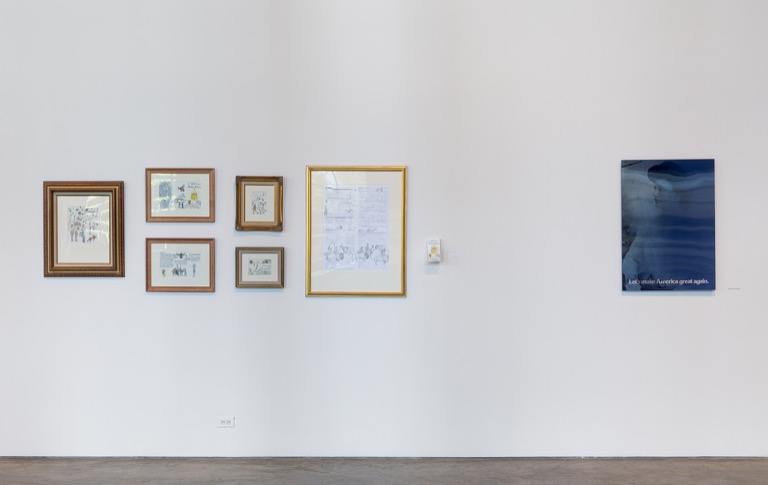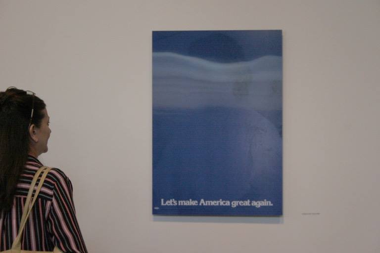 Other artworks reflect upon hot topics debated on the televised stage and during the long primary season leading up to the Republican and Democratic National Conventions this summer. Issues such as immigration are evident in Isabella Cruz-Chong’s sound installation Line of Breath that portrays the human dimension of the border between the United States and Mexico. Daniel Bejar brings forward Isabel Gonzalez who pioneered legislation to make all Puerto Ricans American citizens—his lenticular photographic work declares “Let’s Make America Great Again” which is actually a 1980 Reagan campaign slogan that has been co-opted by Trump.
