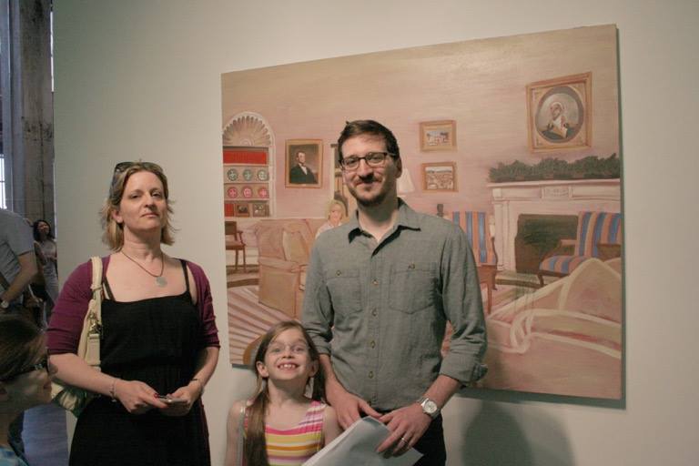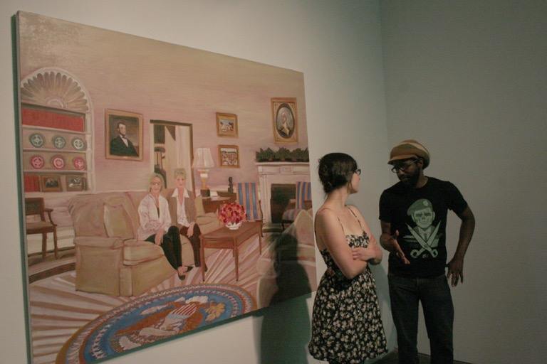 Looking towards the past to enlighten the future, art historical strategies can be found in Of the people. Neither the partisan elephant or donkey but nevertheless taking cues from the 19th century satirical cartoons of Thomas Nast, the bull in Esteban del Valle’s mural symbolically struggles to maintain the incongruous balance of power between the market and political speech. The traditional odalisque informed by the male gaze is inverted in Guy Ben-Ari’s painting that pictures the Oval Office, the ultimate prize in the presidential contest, and its interior under feminine control.