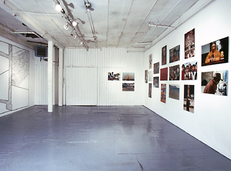 Charlie Citron’s photographs of war zones titled Joe goes around the world describe another aspect of conditioned states, one that anticipates the viewer’s look in a conditioned order of apprehension. Like in the news, the camera shifts perspectives creating a visual architecture from portrait close-up to landscape, then jumping in and out to panorama and half view of different intercultural scenes. Displayed as a horizontal mosaic, which intentionally works against the verticality of the gallery space, Citron’s images depict an order of perception that addresses the west viewing the east. Ironically, the image of children around Citron’s GI Joe, now a cowboy in the role of cultural liaison, gives these bordering spaces a feeling of directness and immediacy, and of chance in the middle of political and territorial indeterminacy. Katya Sander’s 3 Notes on Architecture are drawings that depict architectural space both as real and imaginary, functional and without function. They are comments on the way that architecture shapes our behavior and expectations, especially in relation to notions of fear and safety as well as exclusion and inclusion. Their life-size scale also serves as codes on the relationship between architecture and the human body. City Game TV, Sally Gutierrez’s video, was conceived during the artist’s residency at the World Trade Center in 2001, which consists of six interviews of WTC workers talking about their views when overlooking the city through the buildings’ windows. Their views explore the historical hierarchical language of panoramic visibility as well as the personal language of the individual in their imaginary relationship with the city. Here, architecture is translated by human interaction, and the visual is highlighted by the imaginary.